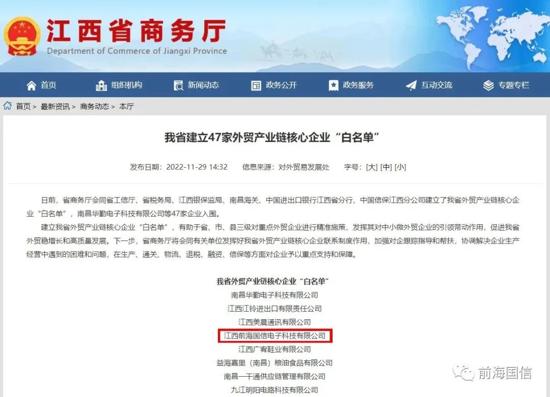 In order to further carry out precise policies for key foreign trade enterprises, give full play to its leading role in small, medium and micro foreign trade enterprises, and promote the steady growth and high-quality development of foreign trade in our province. On November 29, Jiangxi Provincial Department of Commerce, together with provincial Department of Industry and Information Technology, provincial Tax Bureau, Bank of Jiangxi Insurance Regulatory Bureau, Nanchang Customs, Jiangxi Branch of Export-Import Bank of China and Jiangxi Branch of SinoSURE established the "white list" of core enterprises of our province's foreign trade industrial chain. Among them, Jiangxi Qianhaguoxin Electronic Technology Co., LTD., a subsidiary of Guoxin Technology Group, was selected.